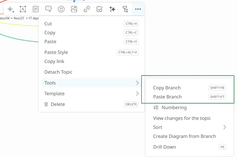 Click the root topic of the branch you want to copy, then click More → Tools → Copy Branch, or simply press Ctrl + C.