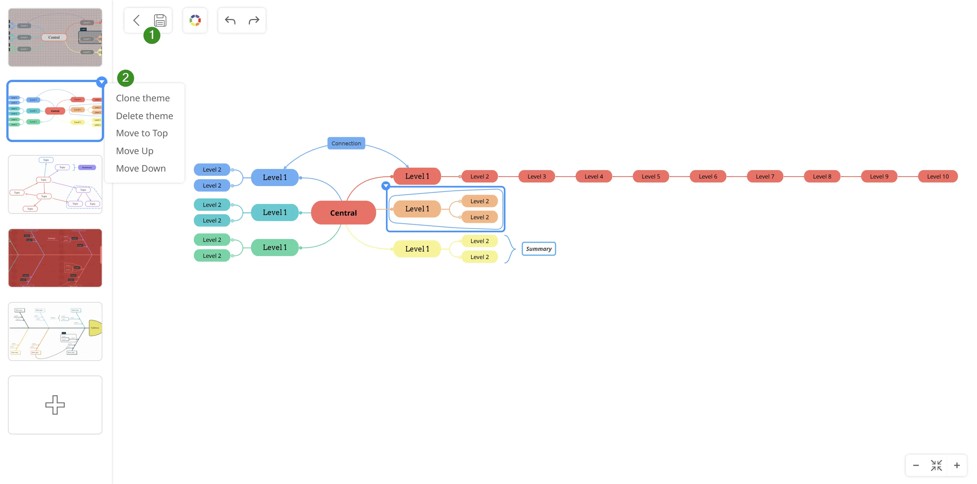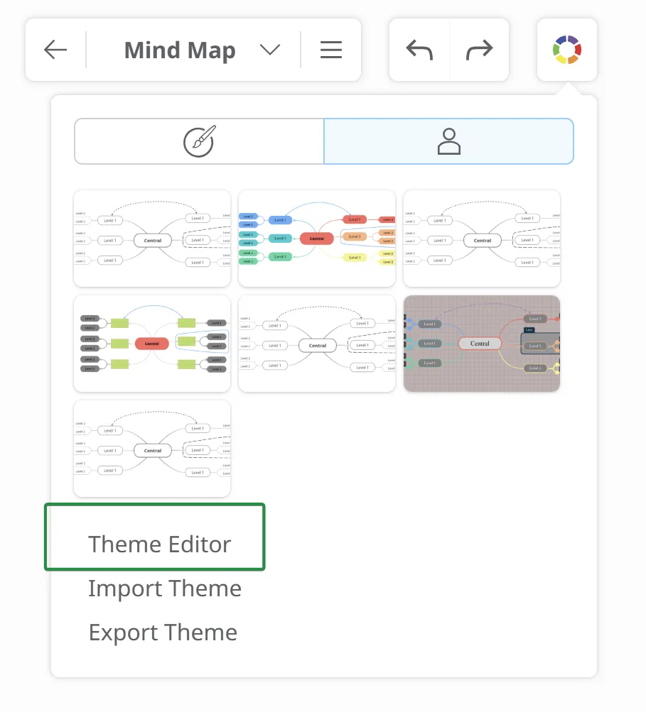 The Theme Editor gives you the possibility to quickly change the way your topics look like, level by level (central topic, main topics, level 2 subtopics, etc.).