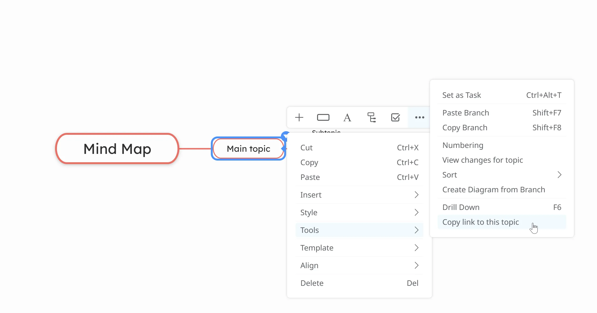 Section titled “Create map from branch”If you feel that your mind map is getting larger than expected and you lose focus on the overview, you can create maps from specific branches. These will be automatically linked to the original mind map. To create a map from branch, focus on the root topic, open the context menu, and go to the More Options panel, choose Tools and then click on Create Diagram from Branch.