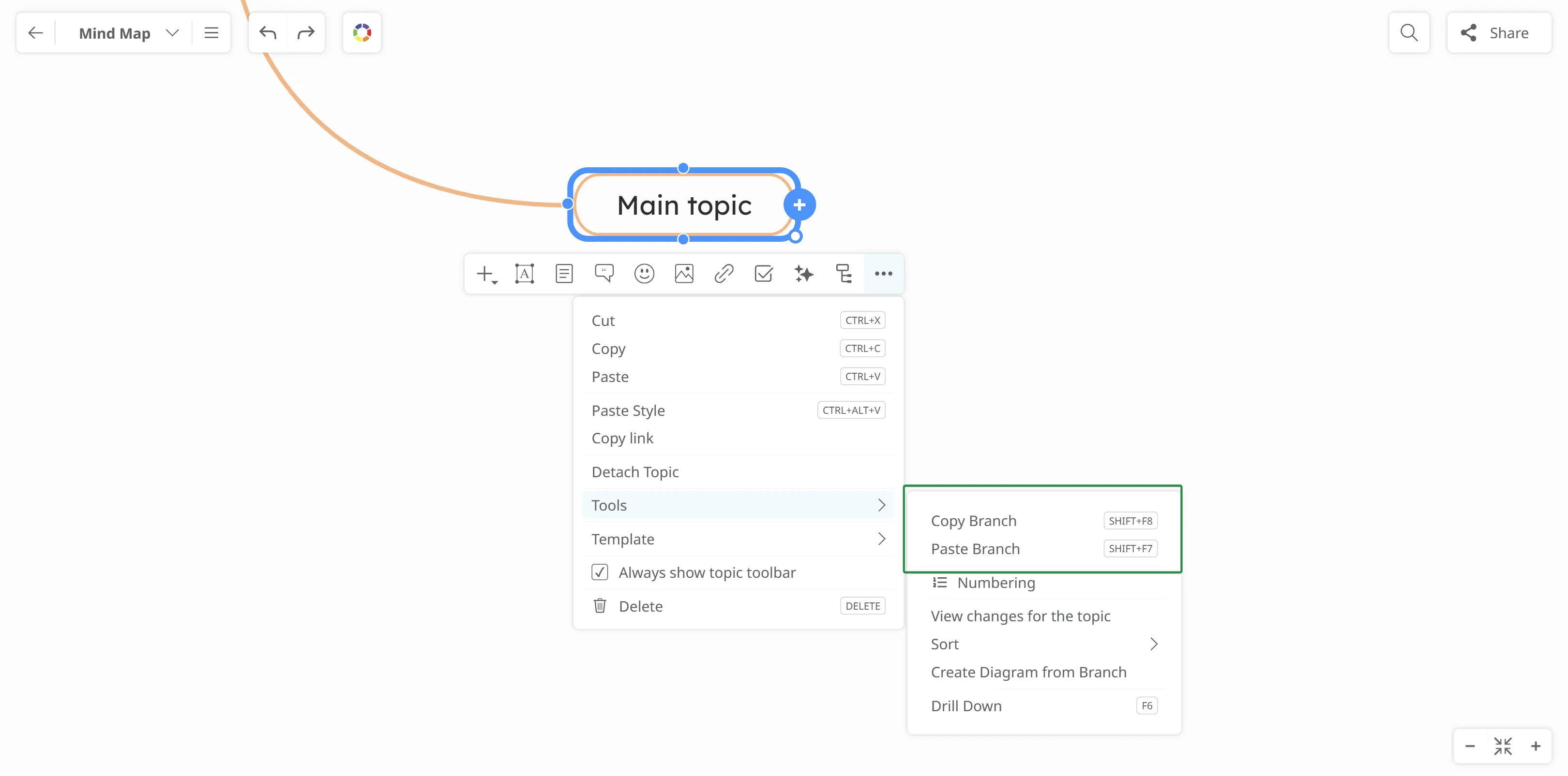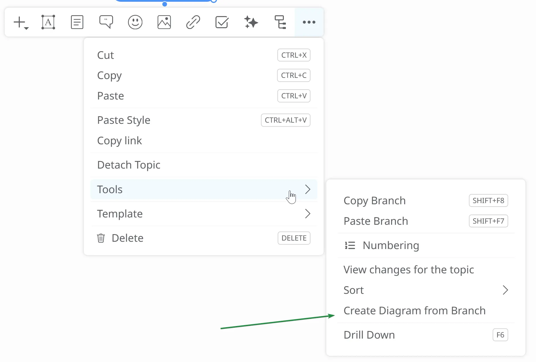 Section titled “Create diagram from branch”If you feel that your mind map is getting larger than expected and you lose focus on the overview, you can create maps from specific branches. These will be automatically linked to the original mind map. To create a map from branch, focus on the root topic, open the context menu, and go to the More Options panel, choose Tools and then click on Create Diagram from Branch.