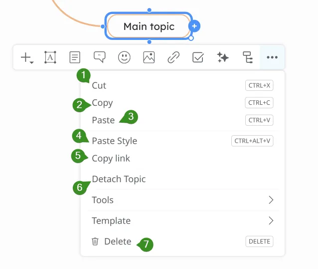 Copy link - copy the link associated with the selected topic. The copied link, when opened in a browser, will open the mind map with an arrow animation pointing to the selected topic, and the rest of the diagram will be blurred.