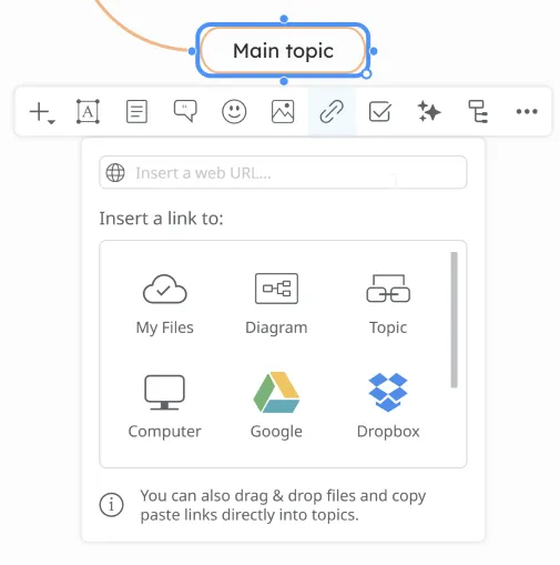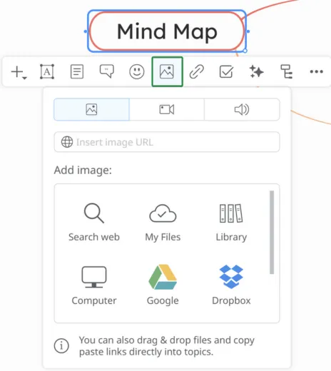 - Upload from - select from multiple options to upload a new document to the mind map (from Computer, Google Drive, Dropbox, OneDrive)