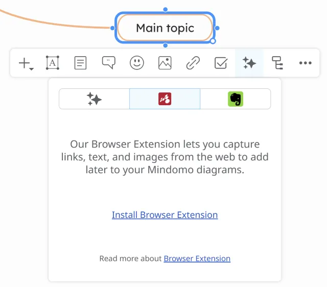 Mindomo Bookmarks is a browser extension and integration tool that lets you save text, links, and images from web pages and send them directly into your mind maps.