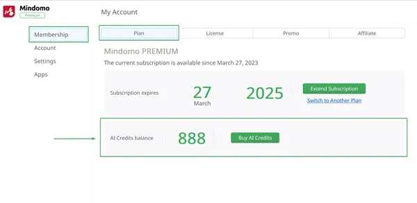 En la sección Membresía, bajo la pestaña ‘Plan’, puedes ver cuántos créditos de IA tienes. El botón Comprar Créditos de IA te permite comprar créditos de IA adicionales, aumentando tu saldo de créditos.