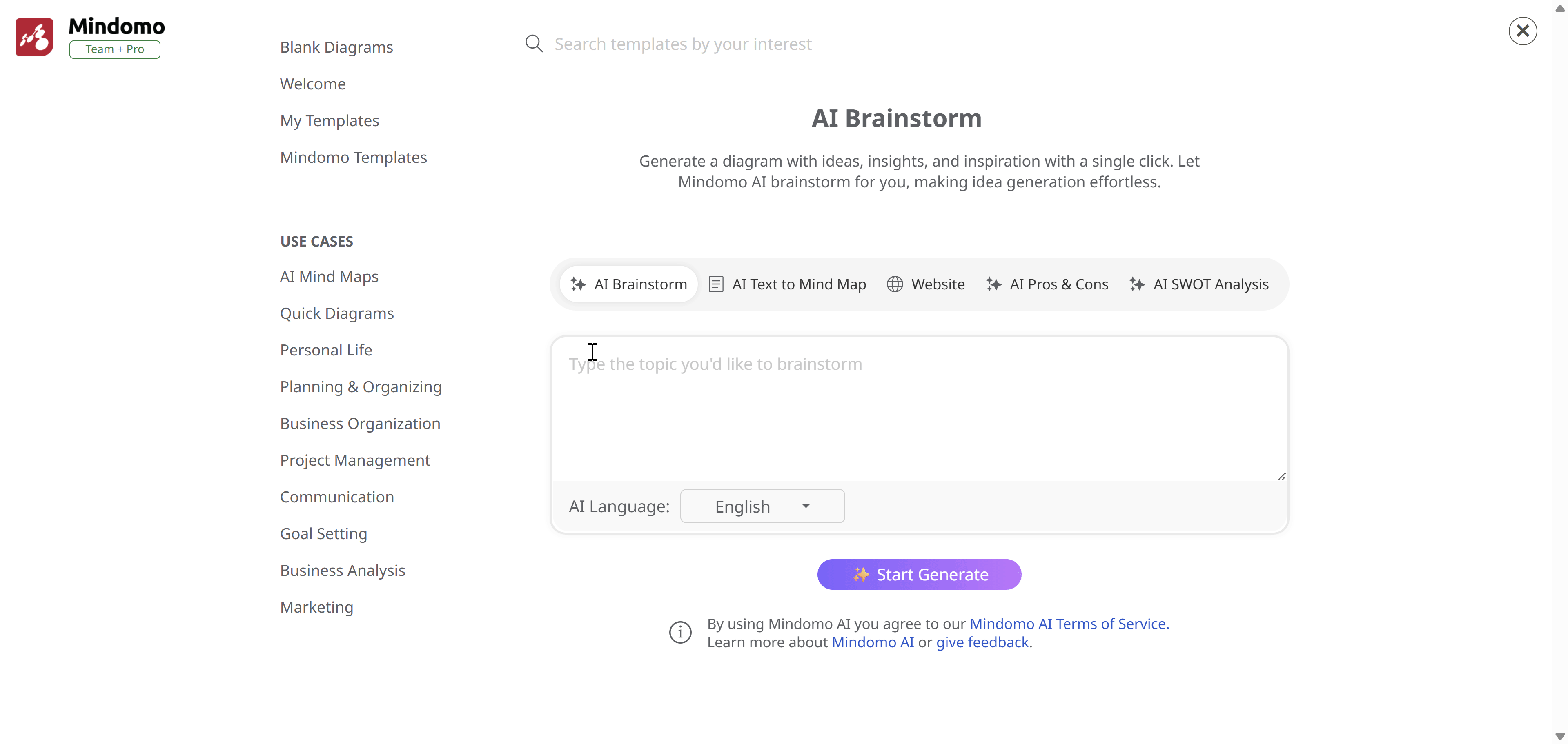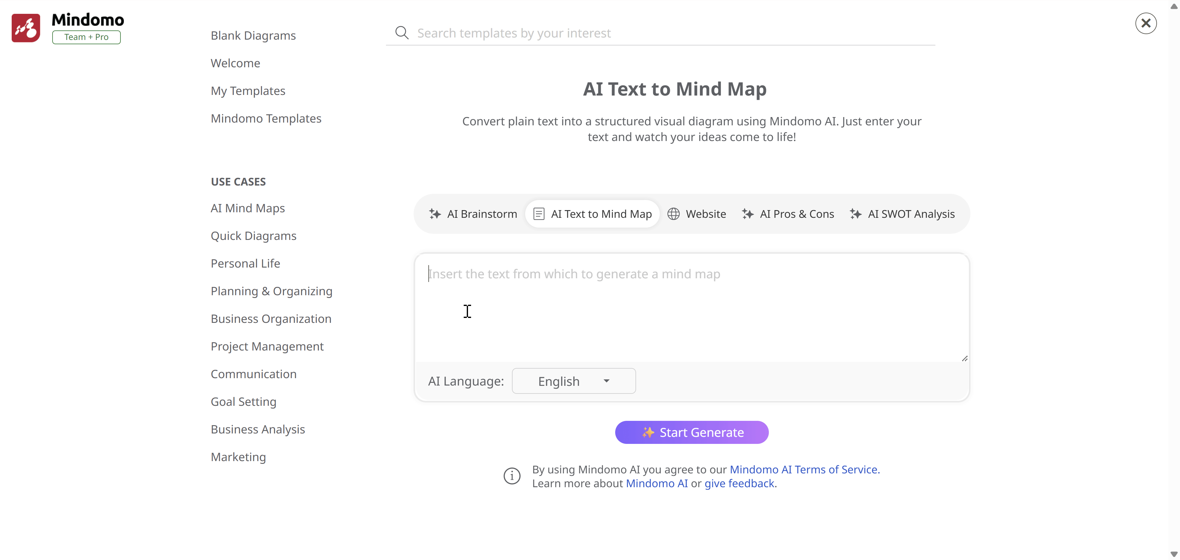 Sección titulada «Generar Diagrama de IA a partir de Texto Plano»Con la ayuda de Mindomo AI, puedes convertir texto plano en un diagrama estructurado. Elige Texto a Mapa Mental de IA, escribe o pega un bloque de texto, haz clic en Iniciar Generación, y observa cómo tus ideas se transforman en un diagrama.