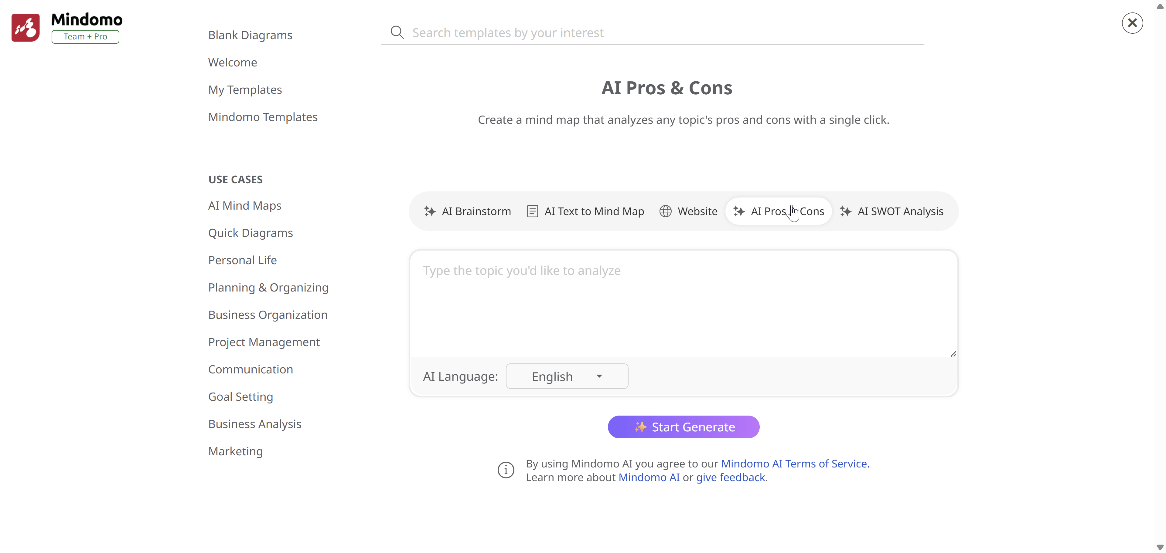 Sección titulada «Generar Diagrama de Pros y Contras de IA»Comienza a crear un mapa de Pros y Contras generado por IA desde cero eligiendo Pros y Contras de IA. Luego, especifica el tema que deseas que Mindomo AI evalúe en el cuadro de texto. Selecciona el idioma en el que deseas que se genere el análisis de pros y contras, o tienes la opción de dejar la configuración predeterminada (Detección automática). Finalmente, haz clic en Iniciar Generación, y observa cómo un mapa con ramas que destacan las ventajas y desventajas del tema se materializa sin esfuerzo.
