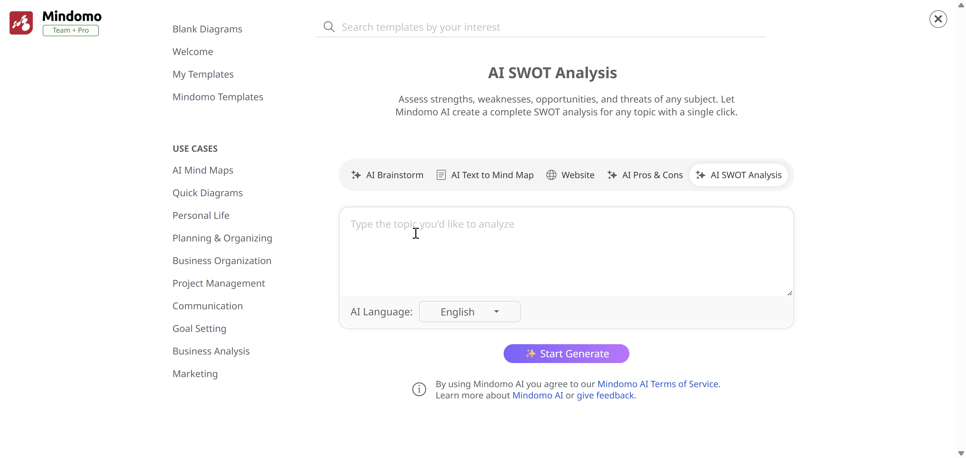 Sección titulada «Generar Diagrama de Análisis FODA de IA»Elige Análisis FODA de IA, escribe el tema que deseas que Mindomo AI evalúe en el cuadro de texto, luego elige el idioma deseado para generar tu diagrama de Análisis FODA, o mantén la configuración predeterminada (Detección automática) y luego haz clic en Iniciar Generación. Se generará un diagrama, que contiene cuatro ramas que representan las fortalezas, debilidades, oportunidades y amenazas asociadas con el tema.