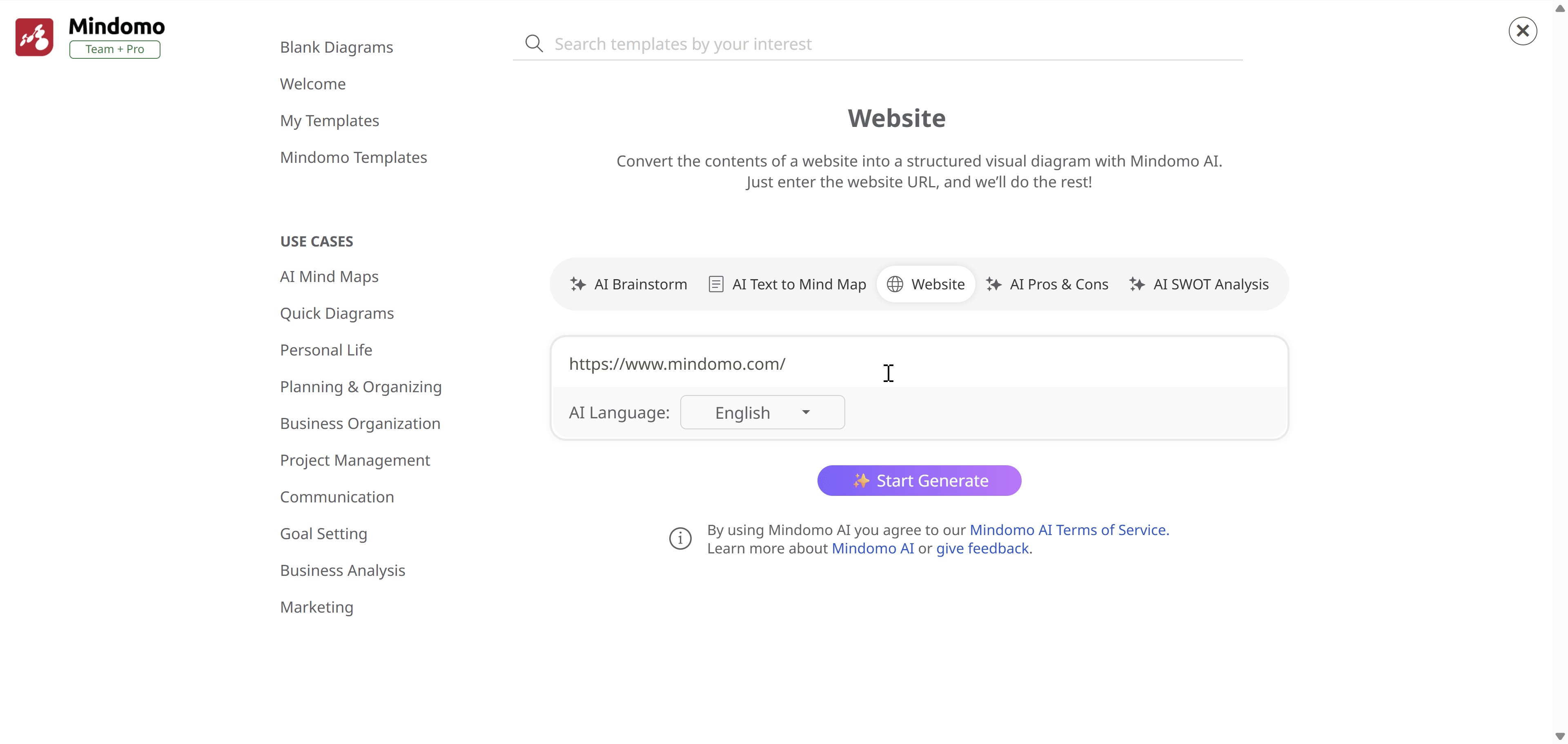 Sección titulada «Generar Diagrama de Sitio Web de IA»Ingresa la URL del sitio web en el cuadro de texto, selecciona el idioma deseado y haz clic en Iniciar Generación. Se creará un mapa basado en el contenido del sitio web.
