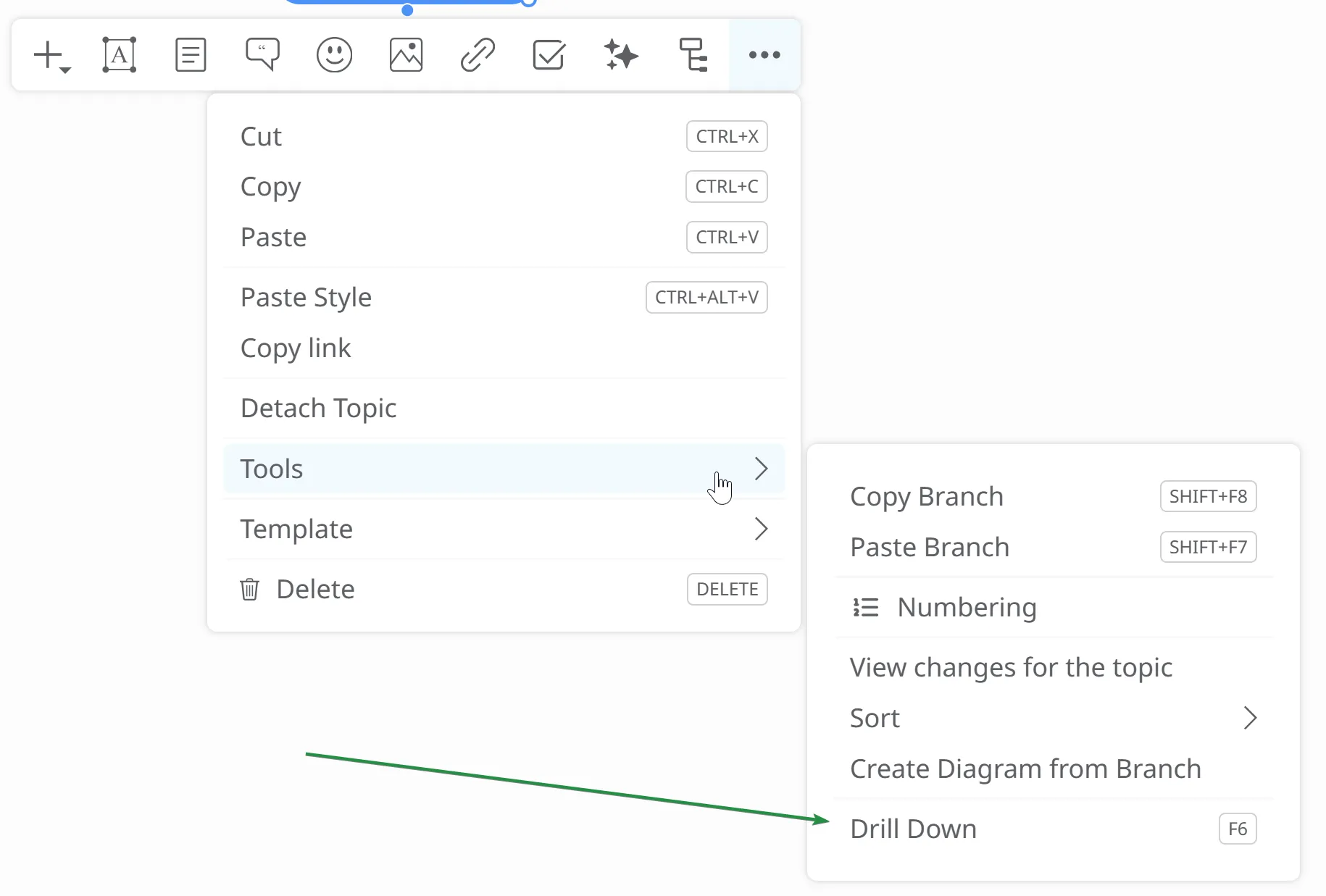 Sección titulada «Profundizar - Enfocarse en una rama específica»Si estás trabajando con un mapa grande y quieres concentrarte en una rama particular, puedes usar la función de Profundizar. Selecciona el tema raíz de la rama, luego presiona F6, o abre el panel de Más Opciones, ve a Herramientas y haz clic en Profundizar. Esto se enfocará en la rama seleccionada y ocultará el resto del mapa mental.