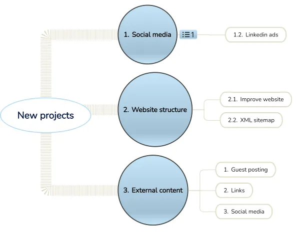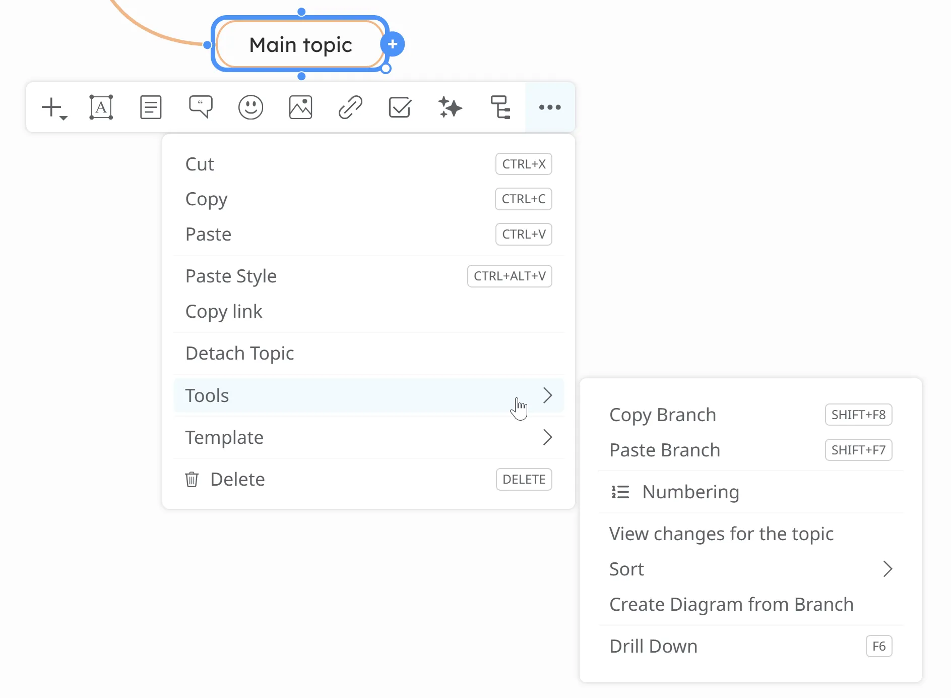 Sección titulada «Crear diagrama a partir de la rama»Si sientes que tu mapa mental está creciendo más de lo esperado y pierdes el enfoque en la vista general, puedes crear mapas a partir de ramas específicas. Estos se vincularán automáticamente al mapa mental original. Para crear un mapa a partir de una rama, concéntrate en el tema raíz, abre el menú contextual y ve al panel de Más Opciones, elige Herramientas y luego haz clic en Crear Diagrama a partir de la Rama.