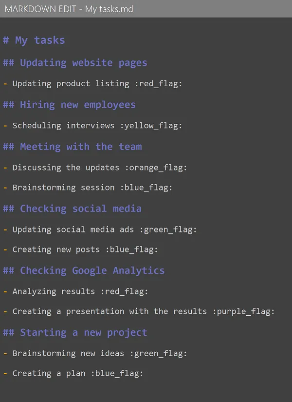 Si deseas incluir tareas en el archivo Markdown que planeas importar a Mindomo, utiliza los siguientes símbolos: