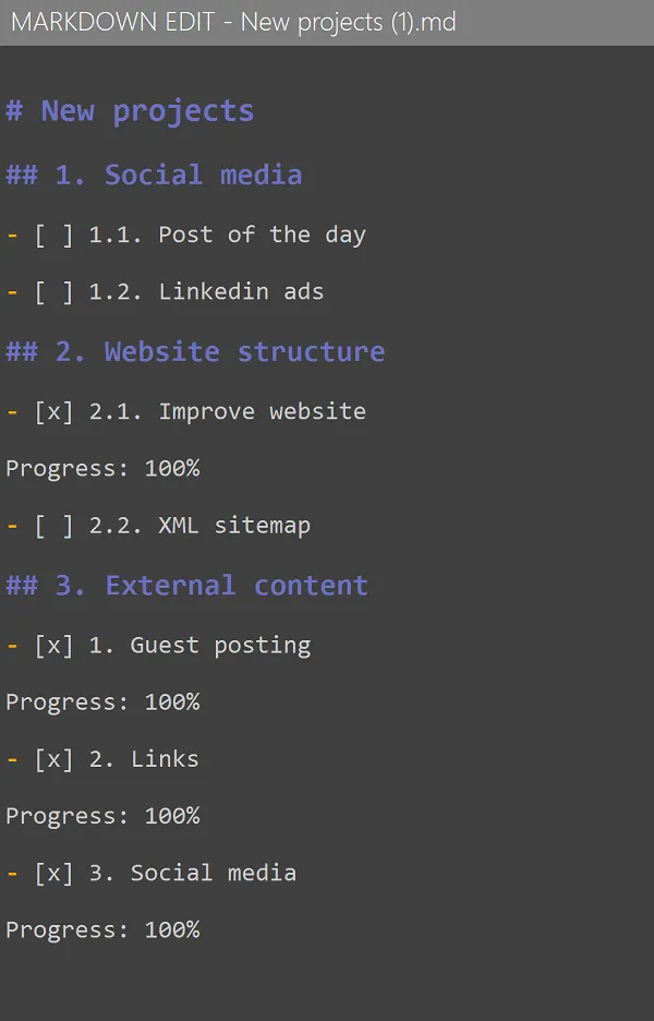 Los detalles de la tarea como Progreso, Prioridad, Fecha de inicio y Fecha de vencimiento se importan como Prioridad, Finalización, Fecha de inicio y Fecha de finalización en el panel de Información de Tareas. En Markdown, estos deben aparecer después del tema relacionado, separados por una línea en blanco.