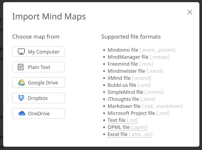 Tienes varias opciones para importar mapas mentales: directamente desde tu computadora, como Texto Plano, o desde Google Drive, Dropbox o OneDrive.