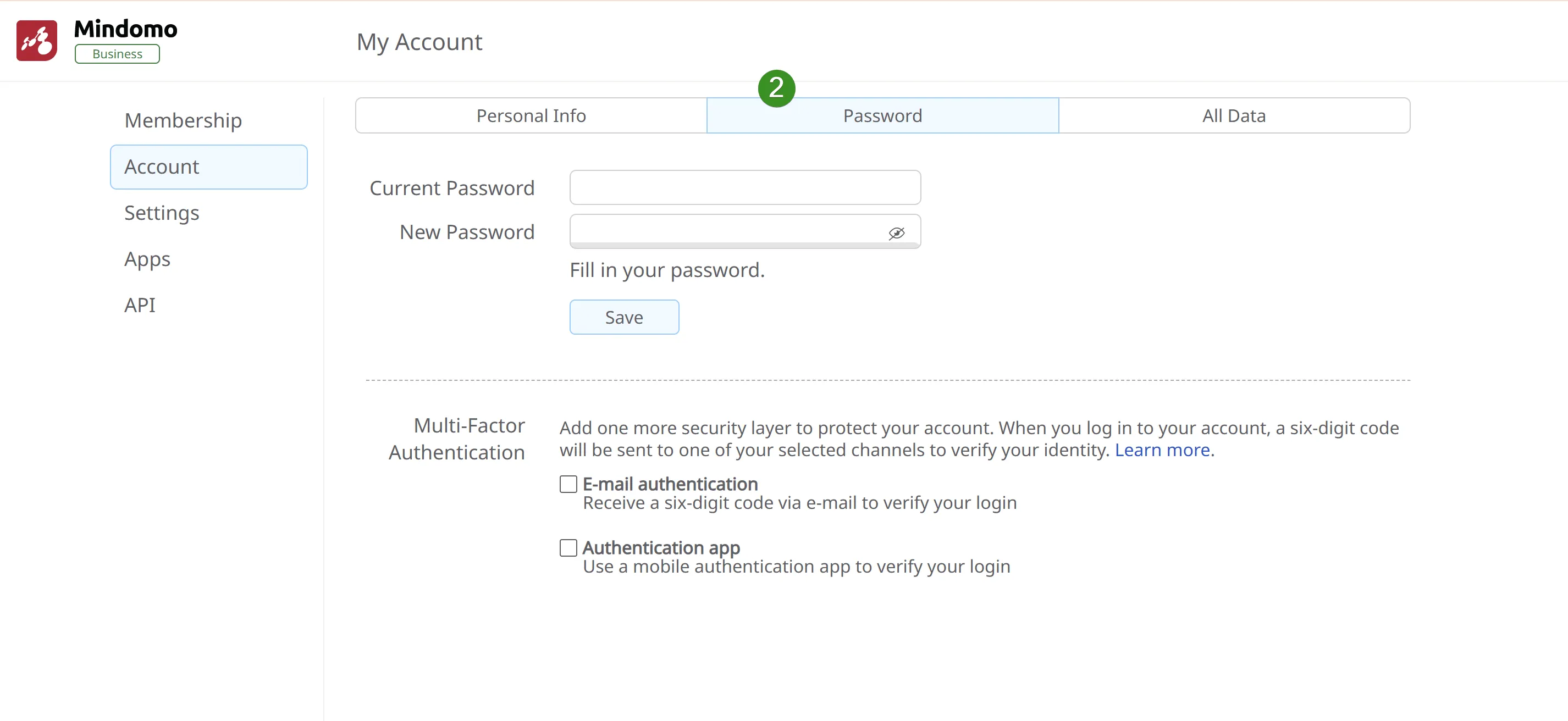 - Para cambiar tu contraseña, ve a la pestaña Contraseña, ingresa tu contraseña actual y la nueva, luego haz clic en Guardar.