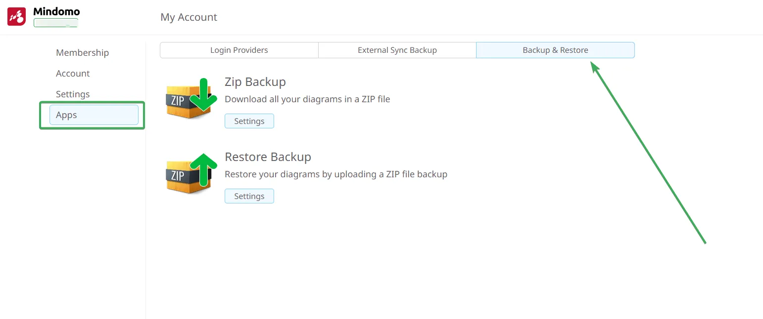 Estas opciones están disponibles en la sección de Copia de Seguridad y Restauración de la configuración de tu cuenta: https://www.mindomo.com/account#apps/zip-restore