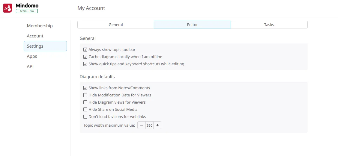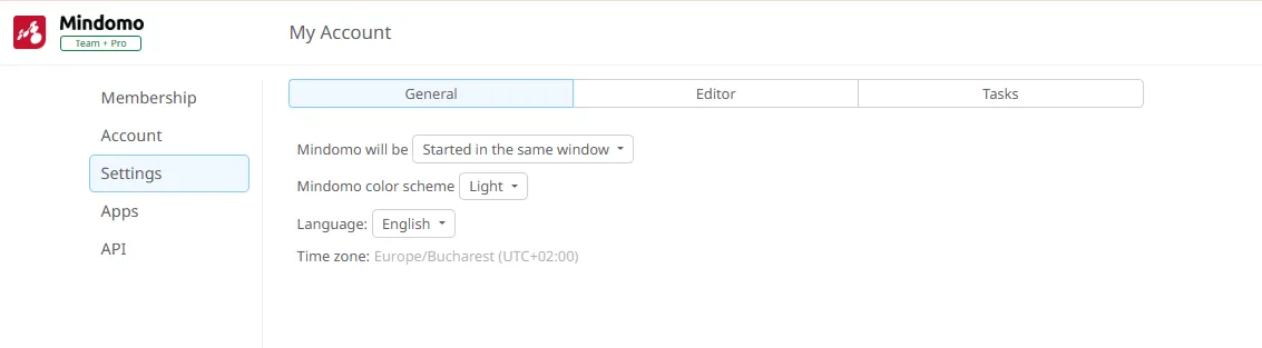 Sección titulada «Configuración»La sección de Configuración te permite personalizar la apariencia y el comportamiento de Mindomo.