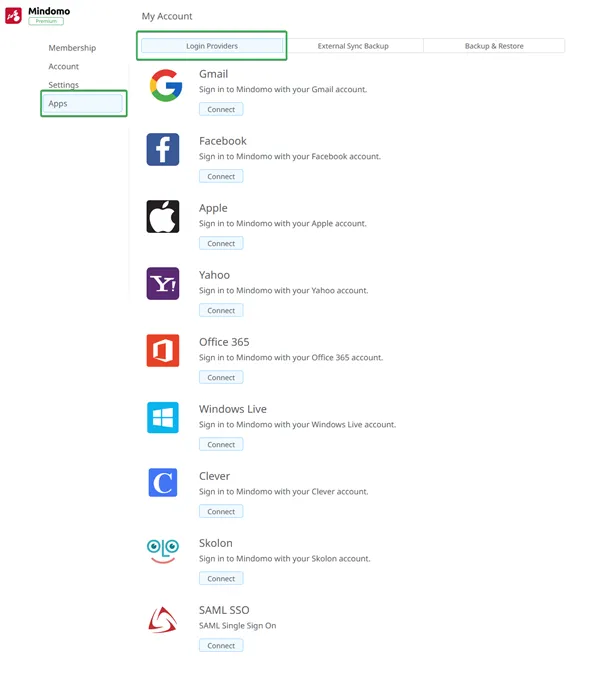 Sección titulada «Proveedores de Inicio de Sesión»Después de crear tu cuenta de Mindomo, puedes conectar varios Proveedores de Inicio de Sesión para simplificar tu proceso de inicio de sesión.