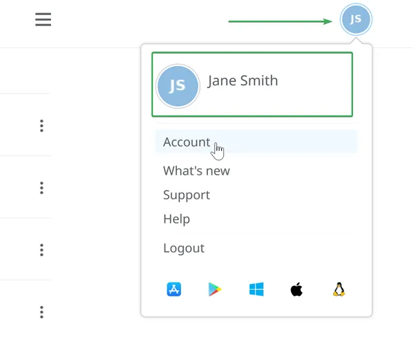 Para acceder al panel de Mi Cuenta, haz clic en tus iniciales o en la foto de perfil en el Tablero, luego haz clic en tu nombre o selecciona la opción Cuenta.