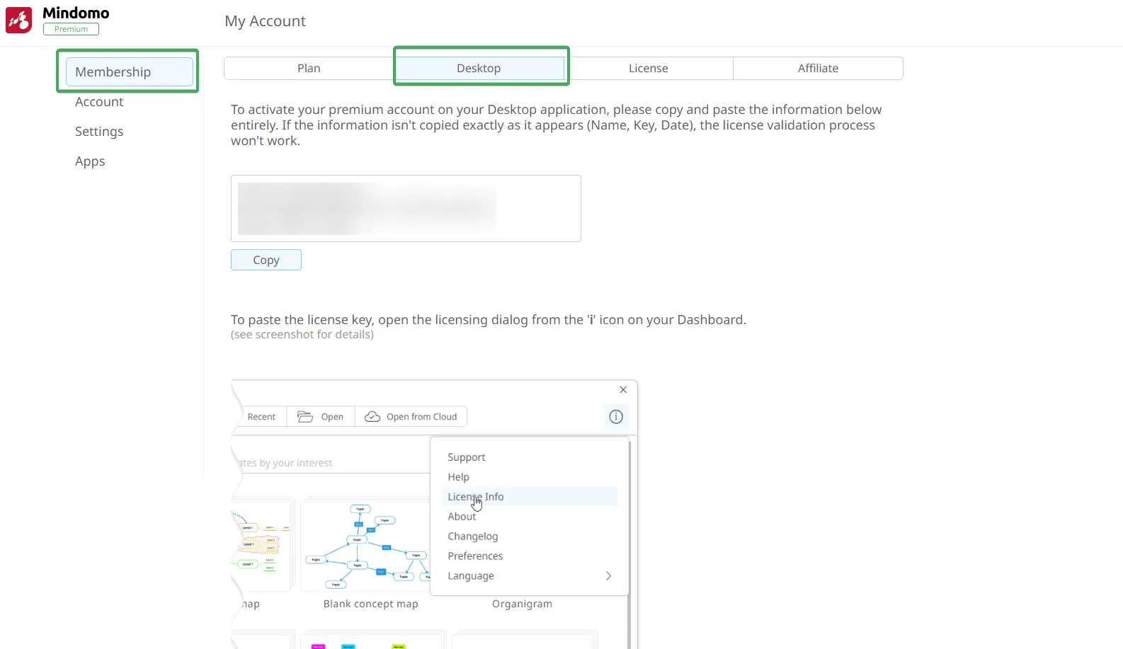 Tu clave de licencia se encuentra en la pestaña Escritorio en la sección de Membresía.
