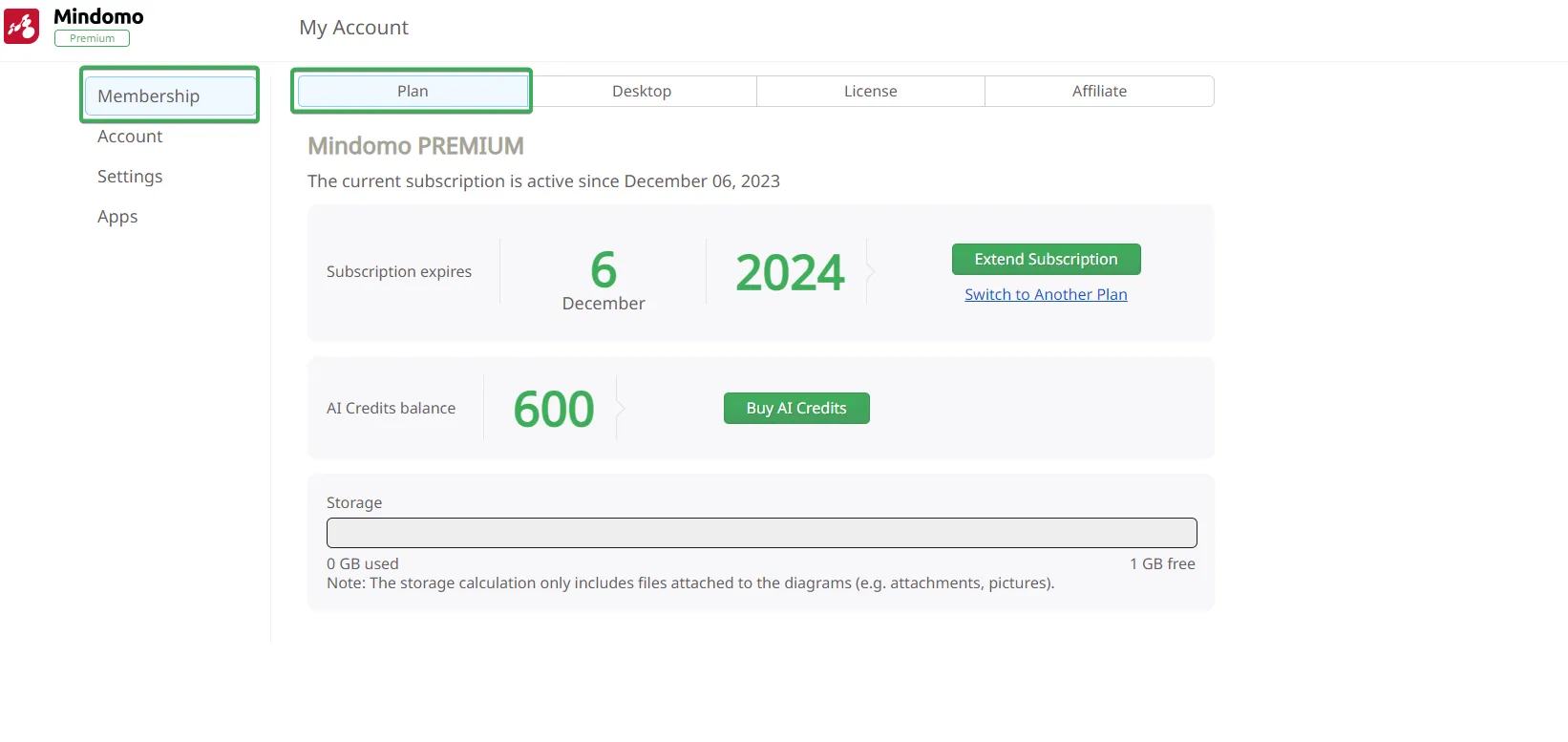 Sección titulada «Cambiar el Tipo de Suscripción»Si ya has comprado un plan, puedes ver sus detalles en el panel de Cuenta. Abre la sección de Membresía y selecciona la pestaña Plan.