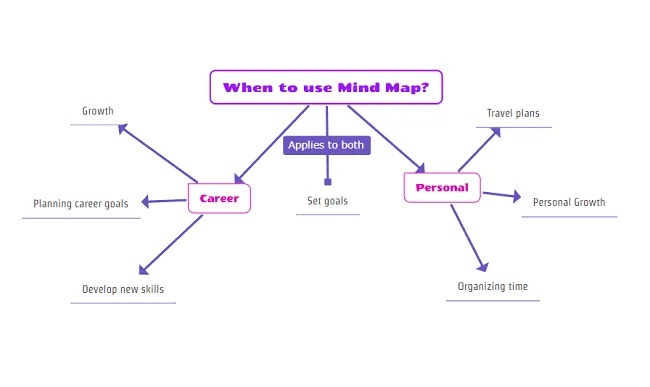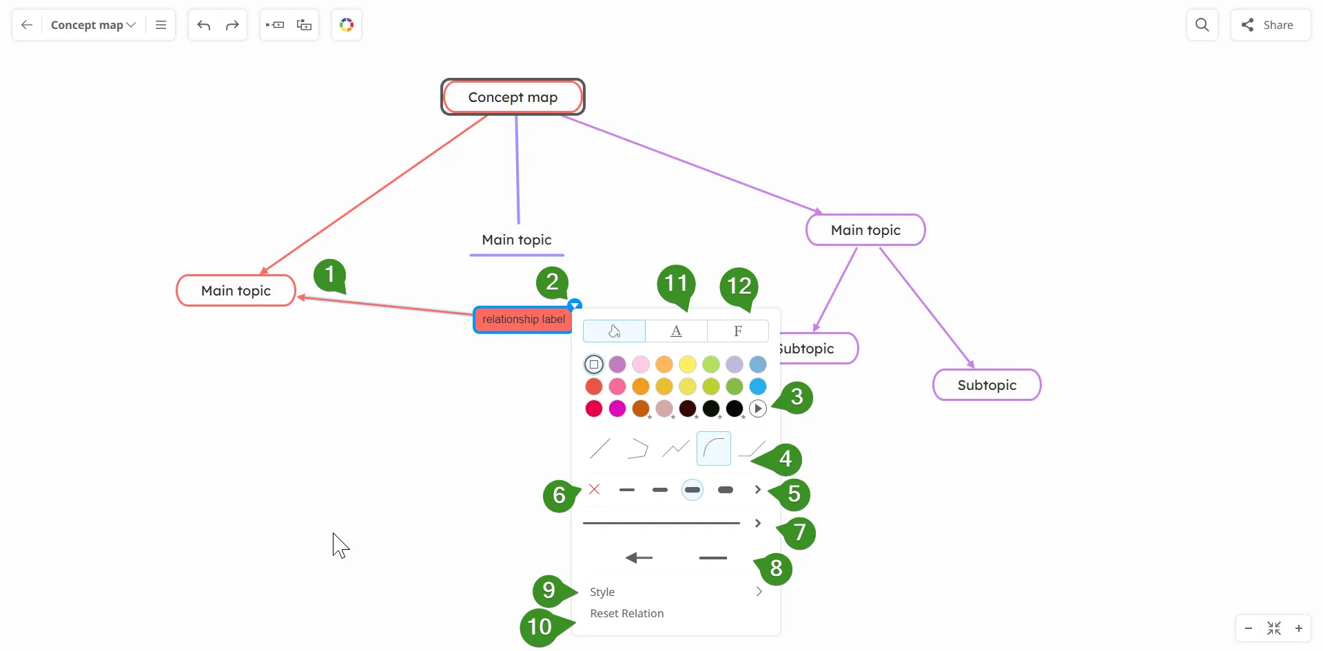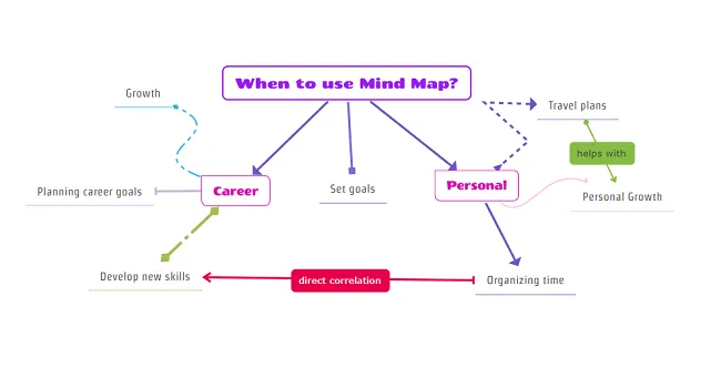Cada vez que añades un nuevo tema en tu mapa conceptual, puedes explicar instantáneamente cómo está vinculado al anterior etiquetando sus líneas de conexión. A medida que agregas más temas, incluso puedes ver nuevas conexiones entre tus ideas.