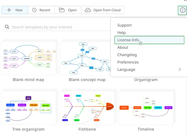 Abre la aplicación y ve al icono “i” >> Información de Licencia.