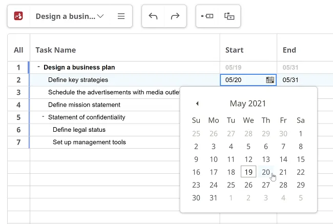 Sección titulada «Establece un cronograma»Establece el marco de tiempo de una tarea abriendo el calendario y seleccionando las fechas de Inicio y Fin.