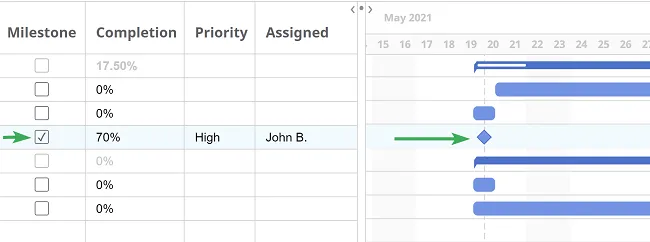 La opción Hito aparece como un símbolo en forma de diamante en el diagrama. Los hitos marcan fechas significativas del proyecto, como eventos importantes o metas. Úsalos para resaltar momentos clave o reuniones de revisión.