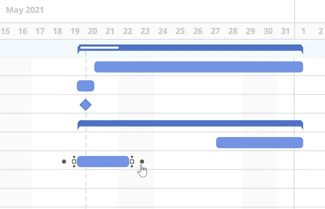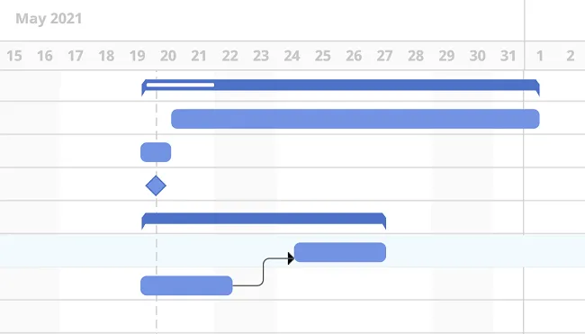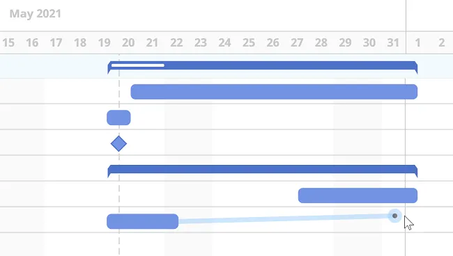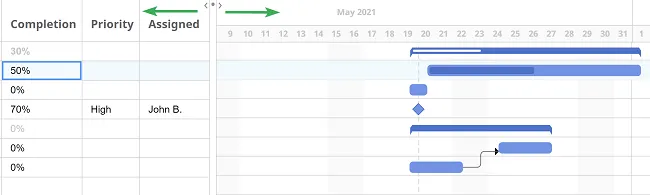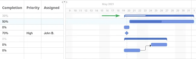 Sección titulada «Crea conexiones entre tareas»En el lado derecho del diagrama de Gantt, puedes agregar dependencias para mostrar cómo las tareas se relacionan entre sí.
