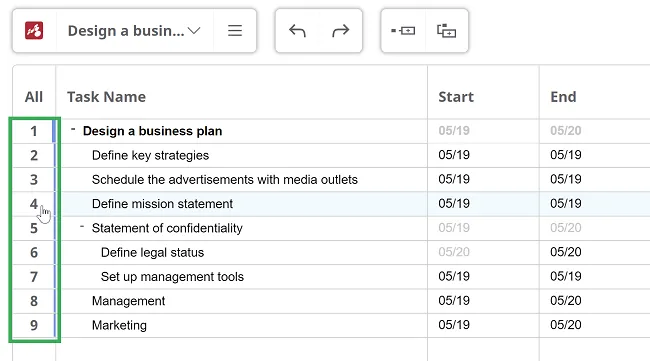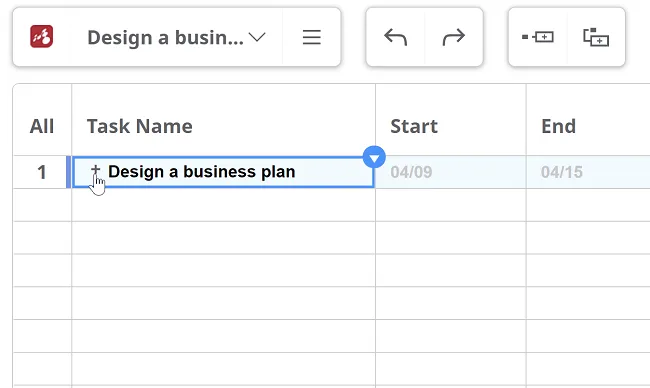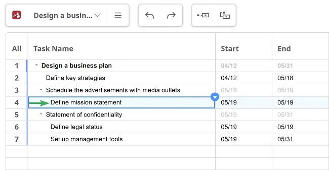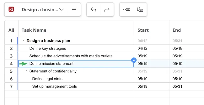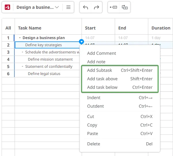 Para construir tu diagrama de Gantt, utiliza una estructura de desglose del trabajo. Usa las teclas TAB y ENTER para crear tareas y subtareas y dale a cada una un título. Alternativamente, se pueden agregar nuevas tareas desde el menú contextual de la tarea principal.