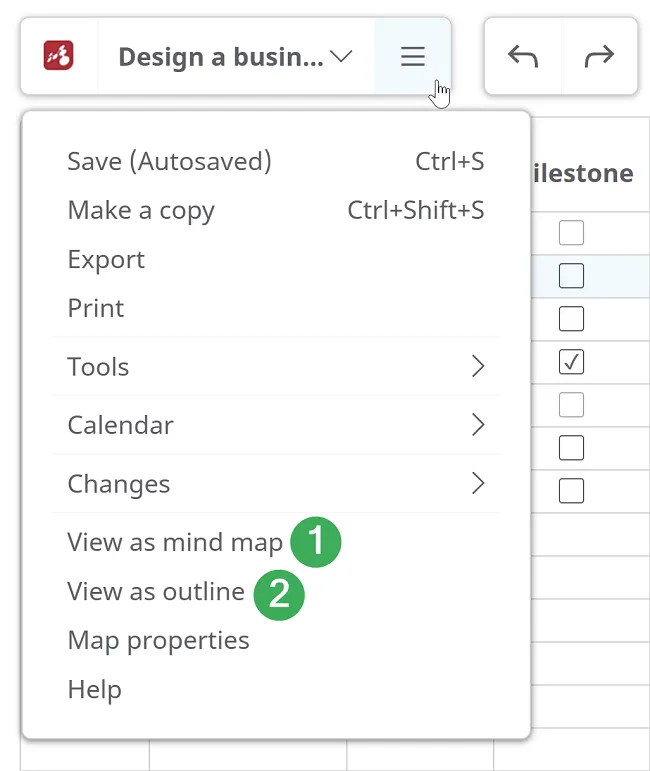 Sección titulada «Cambia la vista de tu diagrama de Gantt»Puedes cambiar tu diagrama de Gantt a una vista de Mapa Mental (1), donde la primera tarea resumen se convierte en el tema central y todas las demás tareas se convierten en temas y subtemas según su jerarquía.