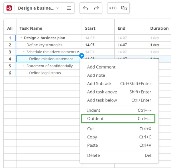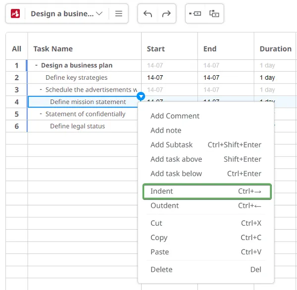 Usa las opciones Indentar y Desindentar para ajustar la jerarquía de tareas. Puedes convertir tareas en subtareas y viceversa.