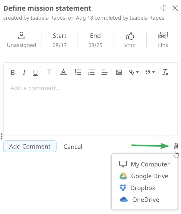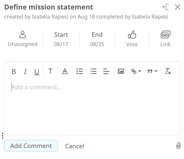 El panel de Comentarios contiene toda la información de la tarea, como plazos, duración, porcentaje de finalización y usuarios asignados.