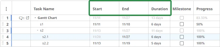 Las tareas deben completarse dentro de un marco de tiempo definido o antes de una fecha límite específica. Cada subtarea también tiene sus propias fechas de inicio y fin o fecha límite.