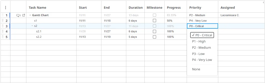 Cada tarea contribuye a la ejecución general del proyecto, y su importancia se puede establecer en la pestaña Prioridad. Haz doble clic en una fila de tarea y elige entre los niveles de prioridad disponibles (de Muy baja a Crítica).