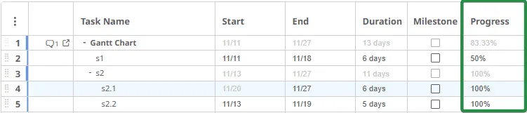 El progreso de la tarea se establece manualmente como un porcentaje en la pestaña Progreso. Los cambios en el progreso de las subtareas actualizan automáticamente el progreso de la tarea principal.