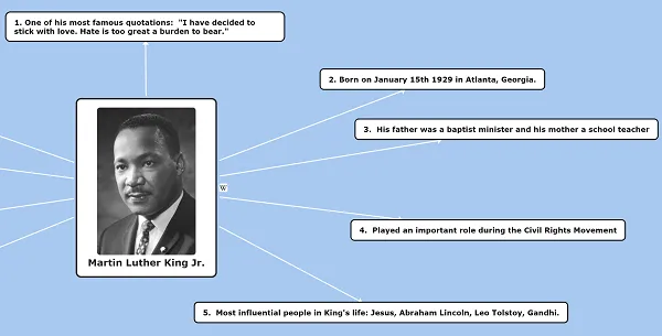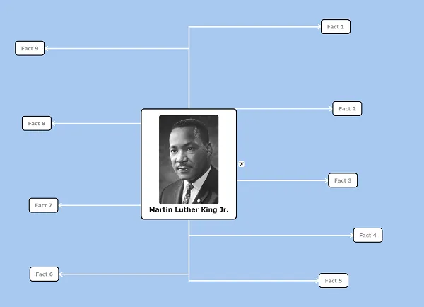Elige una figura histórica: Napoleón Bonaparte, William Shakespeare, Dr. Martin Luther King Jr., etc. Pide a los grupos que presenten 9 hechos sobre la figura histórica elegida. Por favor, ve el ejemplo a continuación: una plantilla donde los estudiantes deben agregar hechos sobre Martin Luther King Jr.