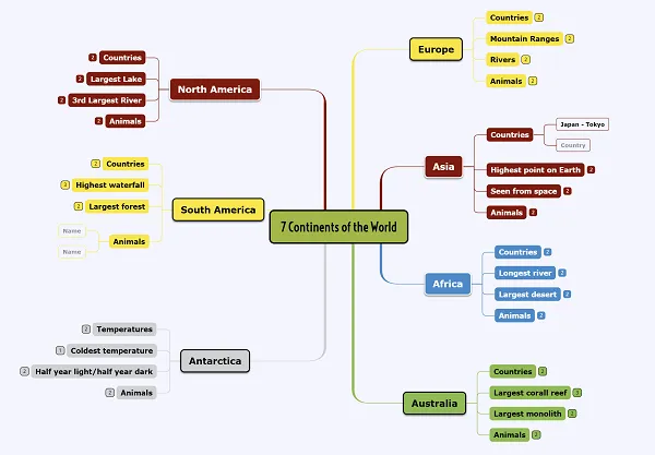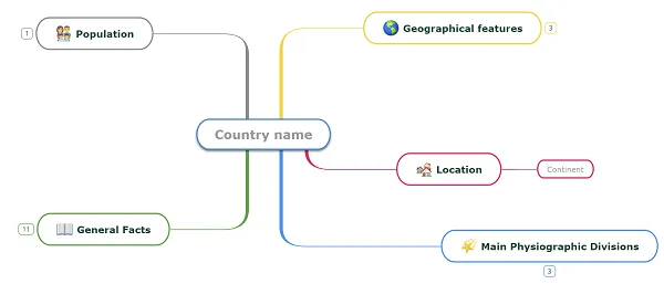Opcionalmente, puedes crear un mapa mental con algunas pautas y adjuntarlo a la asignación para ayudar a tus estudiantes a desarrollar sus mapas mentales. Por favor, consulta el ejemplo a continuación: una plantilla que te ayuda a aprender sobre los países del mundo.