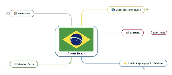 Pide a los grupos que recopilen información sobre las características geográficas de un país/estado/condado y la organicen en un mapa mental. Por favor, consulta el ejemplo a continuación: un mapa mental sobre Brasil.