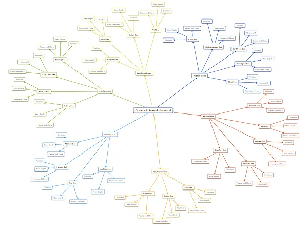 Pide a los grupos que completen esta plantilla con las principales características de los Océanos y Mares del mundo. Pueden agregar la posición del mar/océano, profundidad máxima, flora y fauna de este mar.