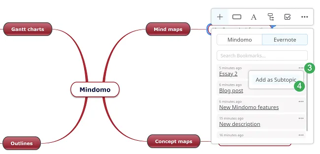Sección titulada «Cómo incluir notas de Evernote en un mapa mental»Elige la nota que deseas insertar como subtema haciendo clic en el menú desplegable a la derecha, luego haz clic en Agregar como Subtema.