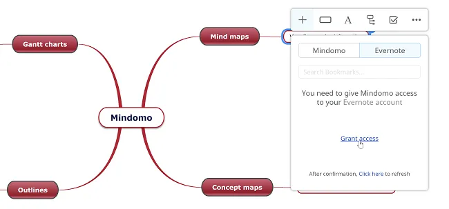 Para integrar tu cuenta de Evernote con Mindomo, primero necesitas otorgar acceso a Mindomo a tus datos de Evernote. Una vez conectados, puedes ver fácilmente tus notas de Evernote dentro de tus mapas mentales e incluirlas como subtemas para enriquecer tus mapas con información relevante.