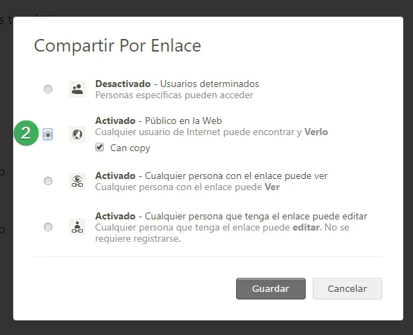 Después de terminar su mapa mental, cuando quiere entregar su trabajo, debe primero publicar el mapa mental. Debe abrir el panel Compartir, hacer clic en “Cambiar” y seleccionar la segunda opción, “Activado - Público en la Web” (2) y hacer clic en “Guardar”.