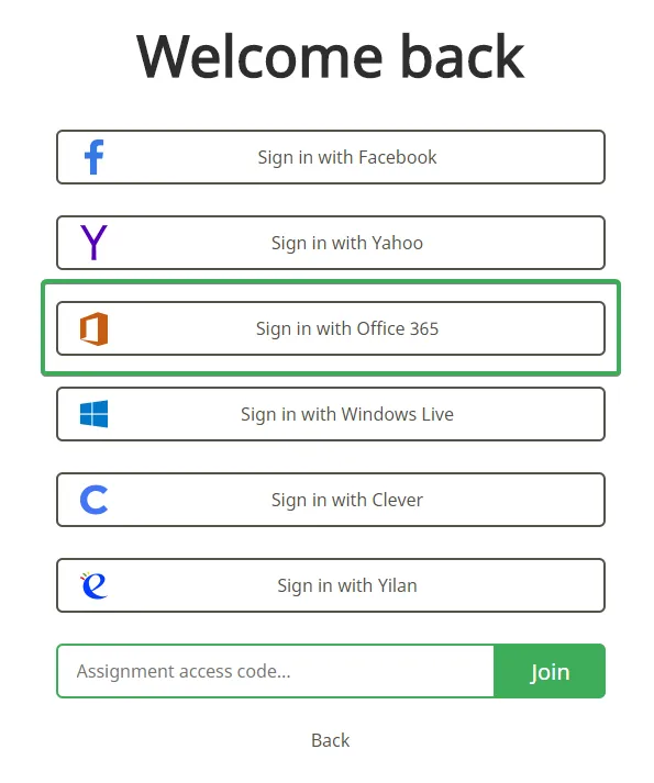 Sección titulada «Inicia sesión usando una cuenta de Office 365.»Desde la sección Iniciar sesión / Registrarse, elige Office365.