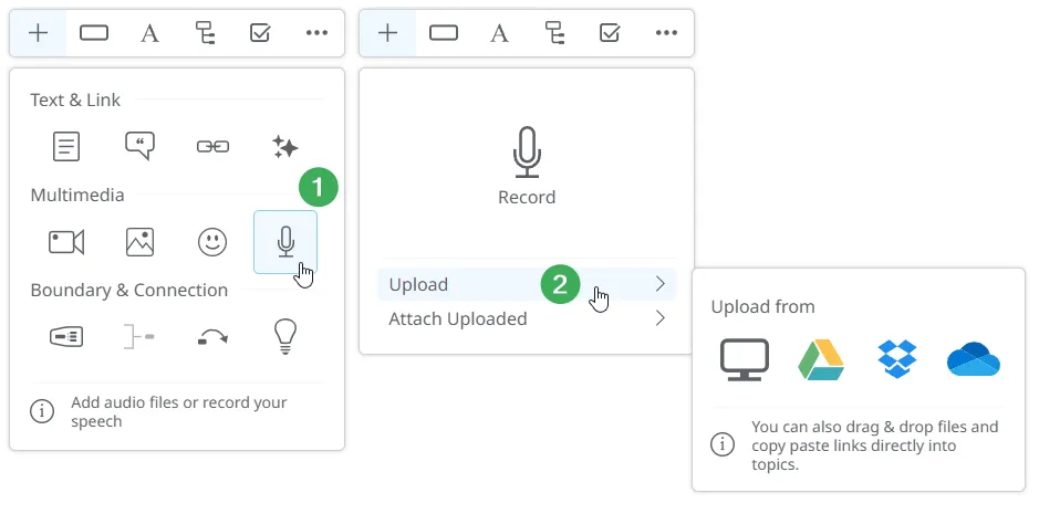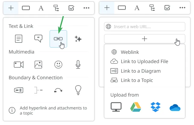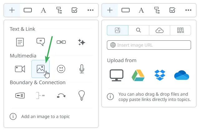 Sección titulada «Selector de Archivos»Con la integración de OneDrive, puedes adjuntar fácilmente archivos almacenados en tu cuenta directamente en tu mapa mental. Puedes acceder al selector de archivos desde los siguientes paneles:
