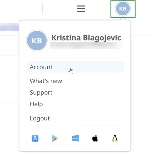 - Haz clic en tus iniciales/foto en la esquina superior derecha del panel, luego selecciona Cuenta.