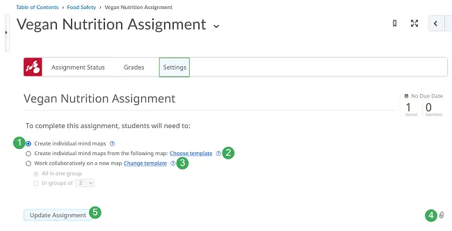 Como propietario del curso, una vez que accedas al enlace de la asignación, puedes configurar y compartir una asignación de mapa mental con estudiantes y otros profesores. La asignación se abre en la sección “Configuraciones”.