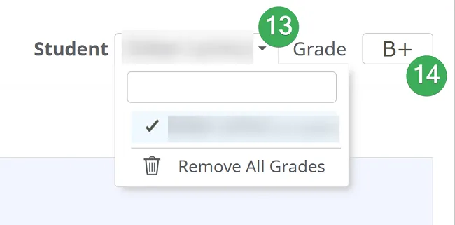 Selecciona un estudiante (13) e ingresa la calificación (14). Los estudiantes calificados se destacan con una marca de verificación.