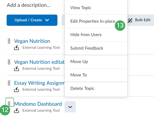 - Selecciona “Panel de Mindomo”. El enlace aparecerá en la sección del curso (12). Puedes ver y editar el enlace cuando sea necesario (13).