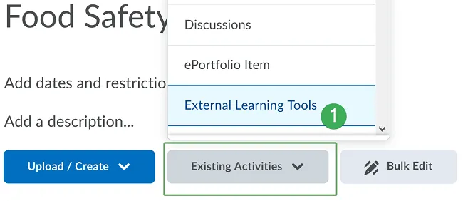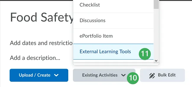 - Elige “Añadir Actividades Existentes” (10) y “Herramientas de Aprendizaje Externas” (11).